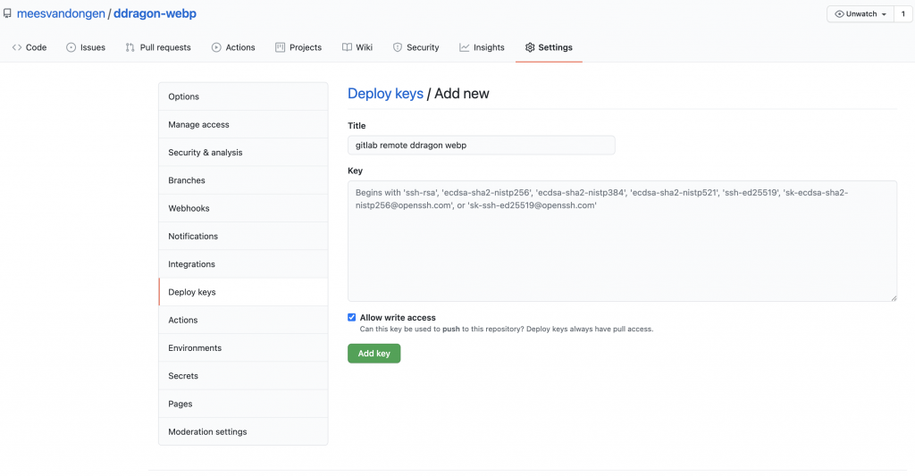 Now all that remains is allowing the SSH key on github. On github, under Settings > Deploy keys > Add new, you can paste the key copied in the previous step. Be sure to check allow write access if the direction is push.