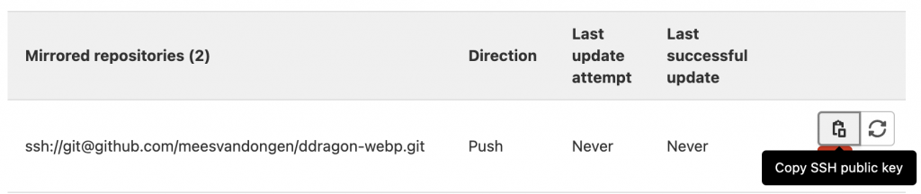 Below the setting for adding new repository mirrors is a list of currently mirrored repositories. For the ssh-based repositories, a button is shown, which must be used to copy the SSH key that gitlab will use for authentication on the remote repository.
