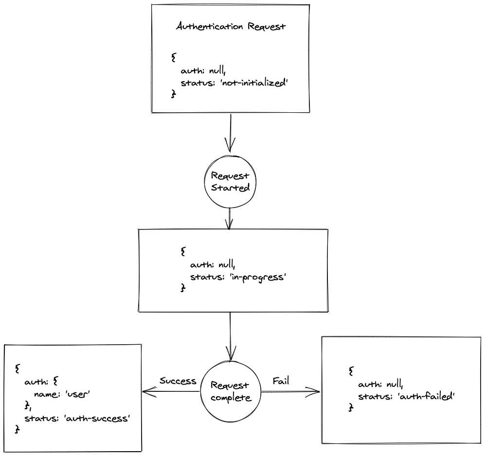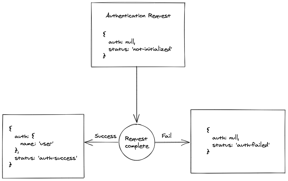 As you can see, we removed the auth instead of setting it to null here, resulting in less code. Typescript prevents you from using 'auth' without checking that status equals 'auth-success'.